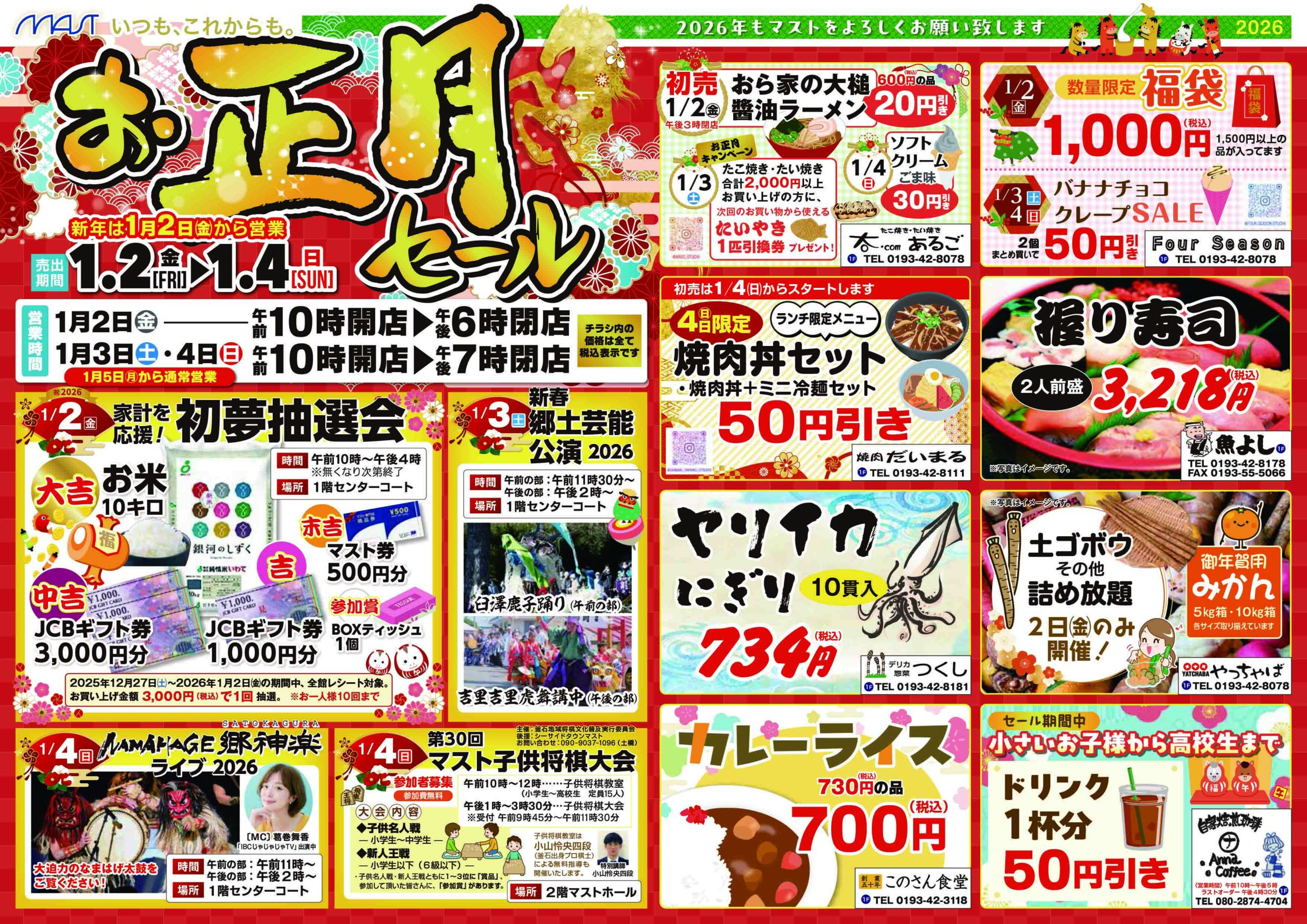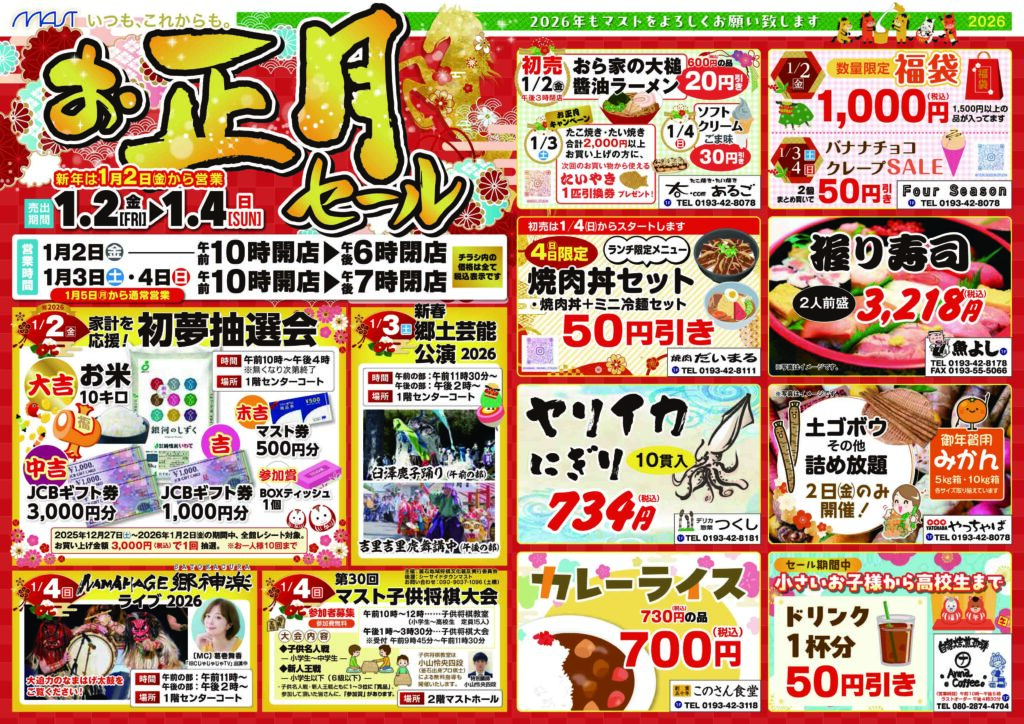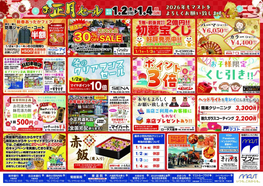 ■下記の店舗は営業します 岩手銀行・北日本銀行・菊屋薬局・司法書士相談センター・大槌住宅管理センター おらが大槌夢広場移住定住事務局・おおつち百年之業協同組合・セルフサービスポート マイヤ・DCMは営業します。 ※2026年1月1日(木)は全館休業