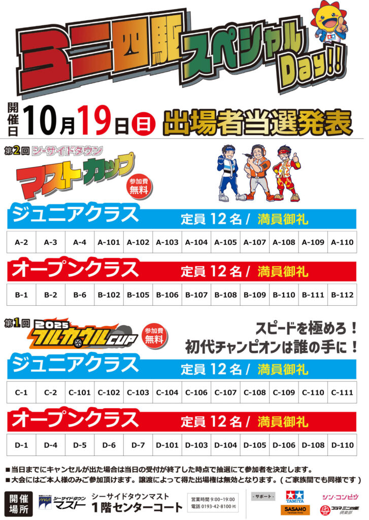 今年もマストでミニ四駆のスペシャルなイベントが開催します! 『シーサイドタウンマストミニ四駆スペシャルDay!!』 10月18日(土)・19日(日)の二日間、ミニ四駆で楽しもう!! 今年から新たなレースとコンクールがスタートします。 物販もコジマ様創業70周年を記念したお得なセットも販売!