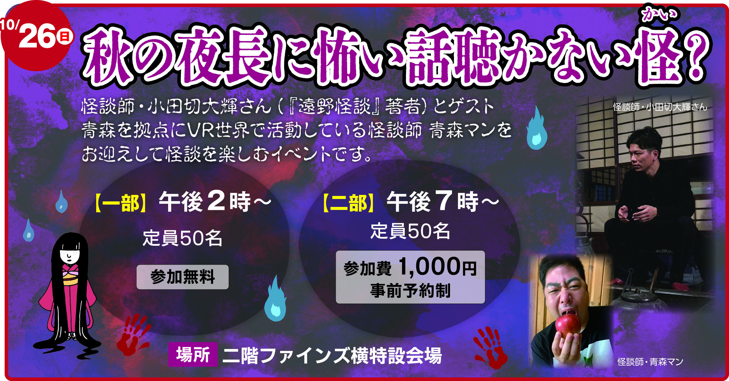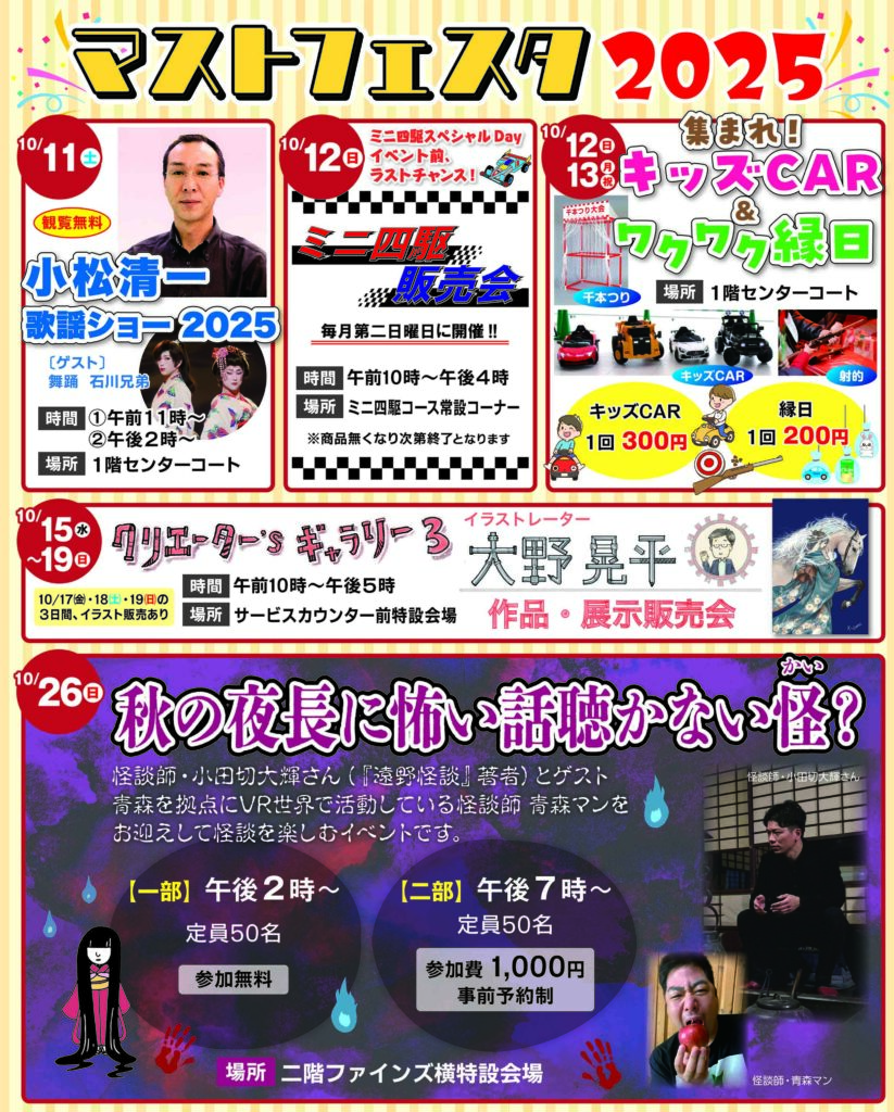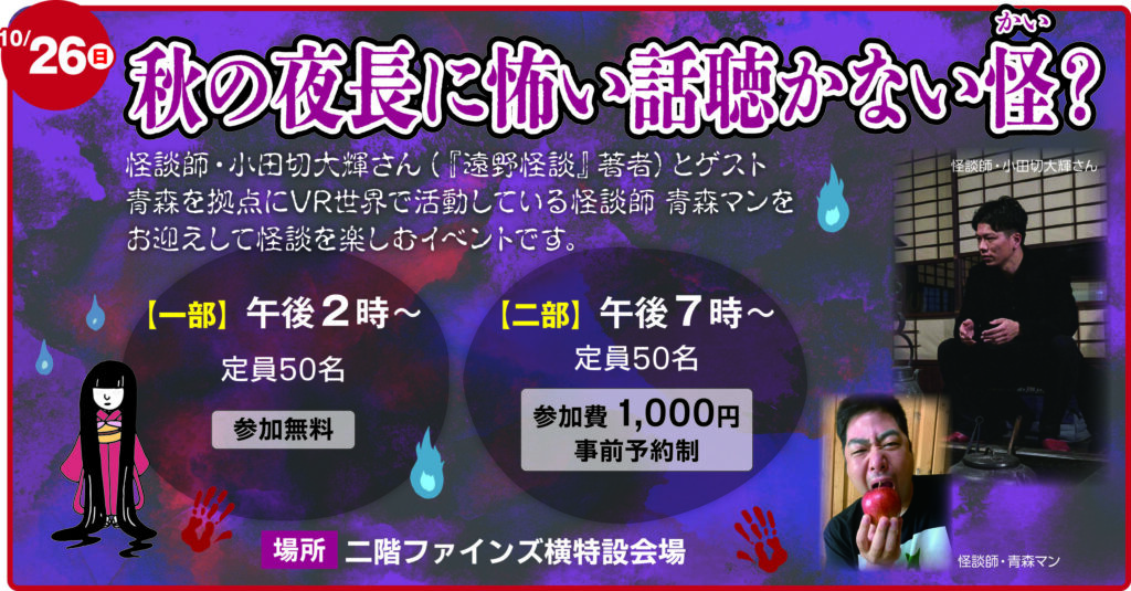 今年も開催いたします! 『秋の夜長に怖い話聴かない怪?』 日時:10月26日(日) 一部 午後2時~ 参加無料 二部 午後7時~ 参加費1,000円 ※事前予約制 場所:二階ファインズ横特設会場 二部の事前受付はこちらから↓↓↓ 店頭受付も行っておりますので、その際はサービスカウンターまでお問い合わせください。 ![]() 2025年09月13日