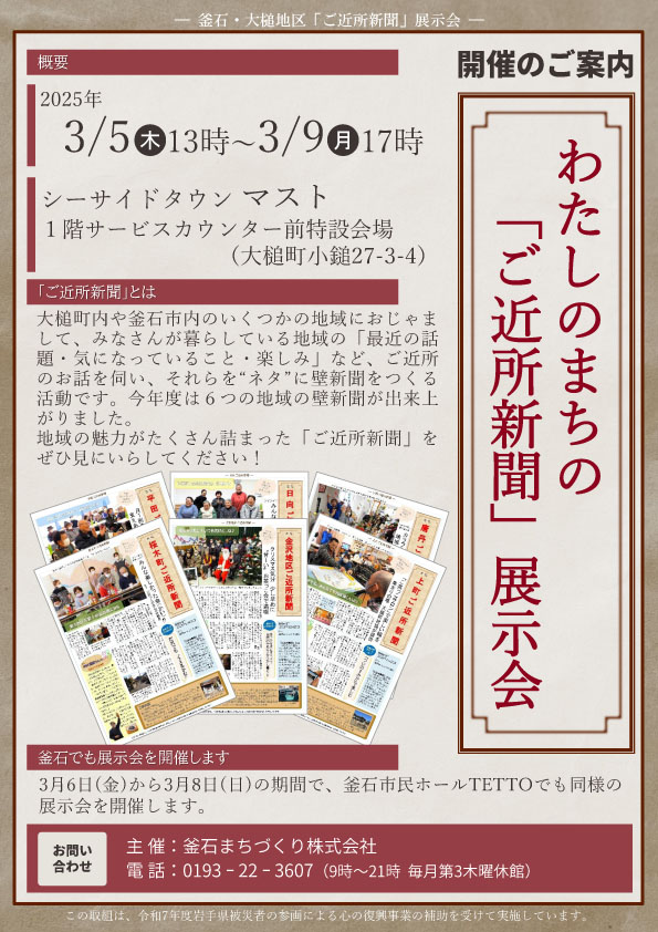 大槌や釜石のいくつかの地域におじゃまして、皆さまが暮らしている地域の「最近の話題・気になっていること・楽しみ」など、ご近所のお話を伺い、それらを“ネタ”に作成した壁新聞の展示会となります。 期間:3月5日(木) 13時~3月9日(月) 17時まで 場所:サービスカウンター前特設会場
